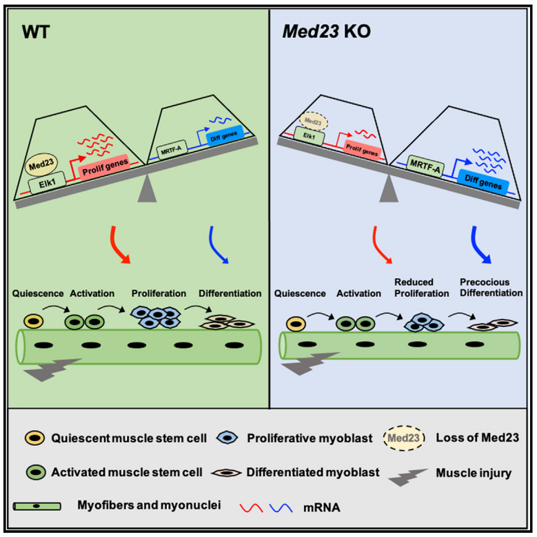 总的来说,这项研究揭示了MED23亚基可以作为肌肉干细胞增殖和分化的分子开关,在MuSCs介导的肌肉再生中发挥重要功能,为进一步理解肌肉再生生物学的分子机制提供了有价值的见解。