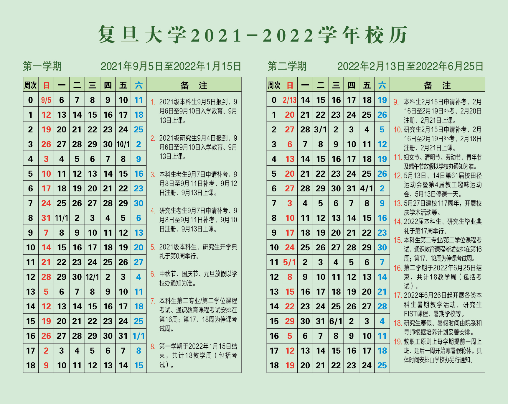 2021年秋季学期于9月13日(第一周周一)开始上课,本学期授课时间16周,第17,18周为集中考试周。随堂考试安排在第16周上课时间。中秋节休假9月19-21日三天,原定9月20日(周一)教学活动调至9月18日(周六);国庆节休假10月1-7日七天,原定10月6日(周三)教学活动调至9月26日(周日),原定10月7日(周四)教学活动调至10月9日(周六)。元旦休假和调课方案以教务处届时通知为准。