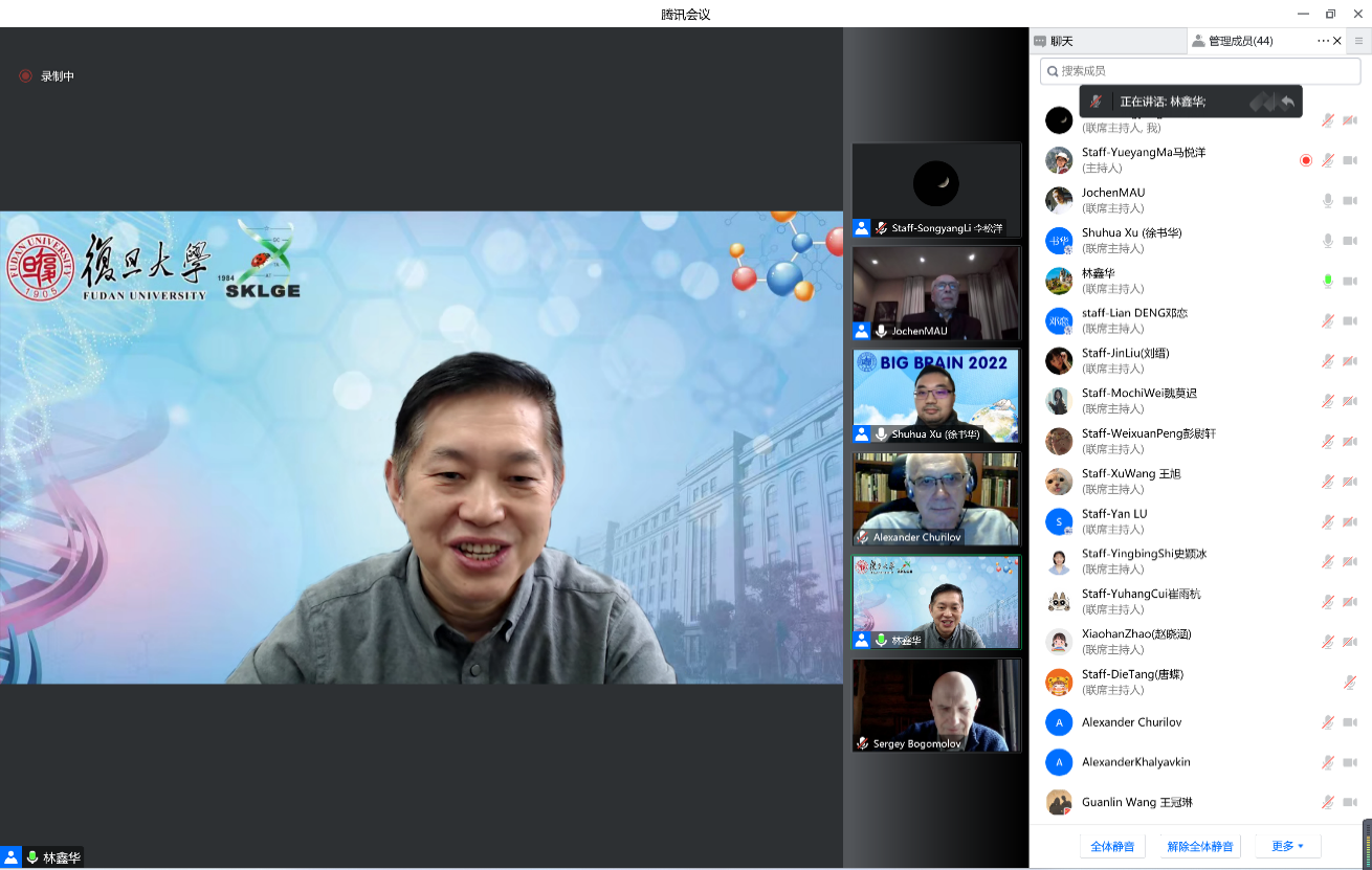 杜塞尔多夫海因里希·海涅大学的Jochen Mau教授强调欧亚大陆拥有共同祖先、历史、环境和共同的梦想,并指出BIG BRAIN会议的具体目标:在欧亚大陆的环境背景下,从整体的、系统的角度,理解人类的身体和疾病,理解基因、表型与环境的相互作用。莫斯科国立罗蒙诺索夫大学Sergey Mukhin教授、Sergey Bogomolov教授和复旦大学田文华教授先后致辞,感谢主办方克服新冠疫情影响举办BIG BRAIN会议,充分肯定此次会议成功举办对于科学和国际交流合作的重要意义,高度期待本次会议上各国科学家的成果展示与交流。