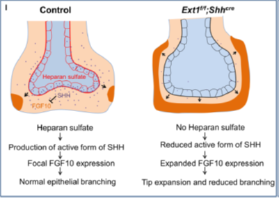 在正常的肺分支发育过程中,上皮细胞产生的SHH传递信号至间充质细胞以调控Fgf10的表达模式。在小鼠的肺上皮细胞中条件性敲除HS的合成酶基因Ext1使得生物活性形式的SHH在上皮细胞与间充质细胞中的表达均显著降低,并由此导致相关受体细胞中信号活性减弱,Fgf10表达失控,最终导致了分支尖端膨大与分支数目减少。