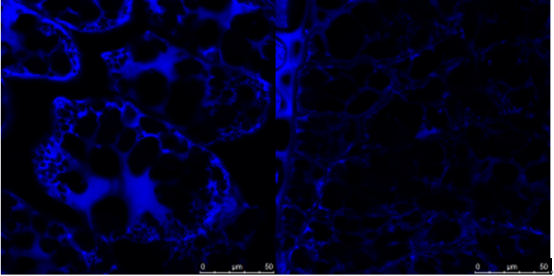 图注:酚类化合物在小麦胚乳中的分布。左:突变体;右:野生型。