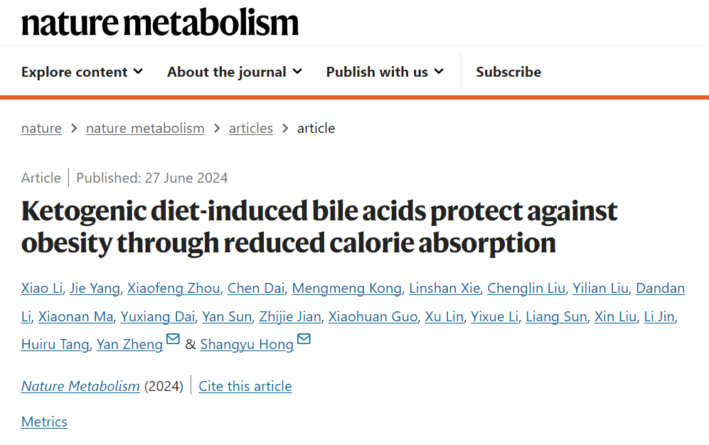 2024年6月27日,bv伟德国际体育洪尚宇研究团队和郑琰研究团队联合在Nature Metabolism期刊上发表了题为Ketogenic diet-induced bile acids protect against obesity through reduced calorie absorption的研究论文,揭示了生酮饮食通过诱导肠道微生物和特异性胆汁酸变化,减少肠道脂质吸收抵抗肥胖的分子机制。该研究发现肠道微生物依赖性的牛磺脱氧胆酸(TDCA)和牛磺熊去氧胆酸(TUDCA)是生酮饮食发挥抗肥胖作用的关键小分子代谢物,肠道碳酸酐酶1(Car1)是介导肠道脂质吸收的关键靶点。研究成果为肥胖及其并发症的治疗提供了潜在的新靶点和候选药物。