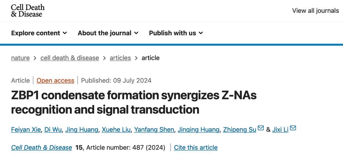 2024年7月,复旦大学李继喜教授团队在《Cell Death & Disease》杂志发表了题为“ZBP1 condensate formation synergizes Z-NAs recognition and signal transduction”的研究论文。该研究通过体外和细胞实验证明,ZBP1的Zαβ结构域能结合不同长度的d(CG)n配体;HSV或IAV病毒感染后Zαβ能够形成具有液液相分离的凝聚体。ZBP1的RHIM结构域形成典型淀粉样凝聚体,其核心基序206IQIG209突变会抑制淀粉样纤维的形成,并阻碍细胞程序性坏死发生和抗病毒免疫的应答信号。本研究发现ZBP1不同结构域可形成凝聚体或淀粉样结构,并通过二者之间的协同作用实现Z型核酸(Z-NAs)的识别和下游信号转导,在应对病毒感染的免疫应答过程中发挥关键作用。