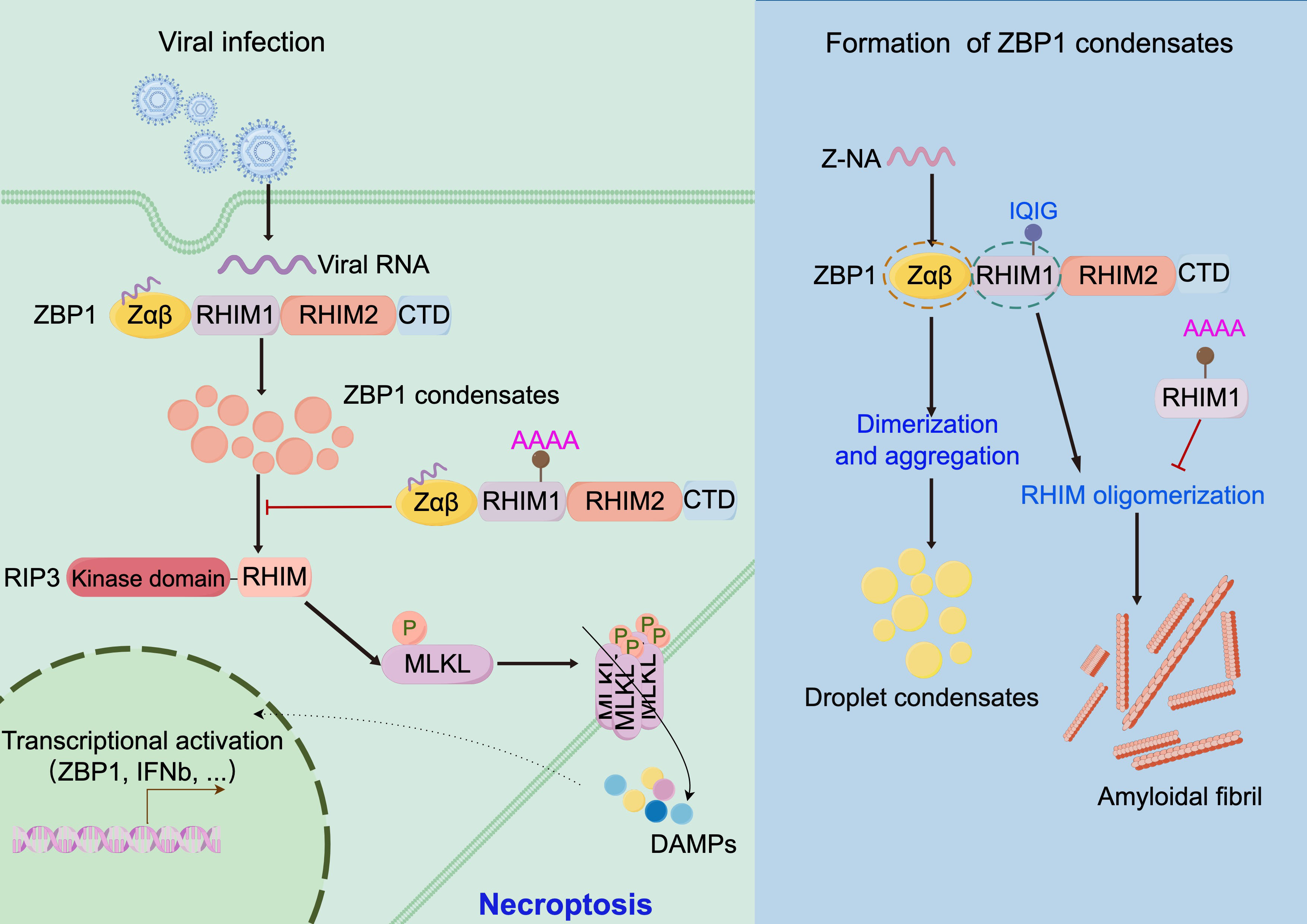 本研究表明ZBP1能够通过Zαβ结构域响应体内异常Z-NAs刺激后,形成一个液滴状凝聚体平台,使ZBP1易于通过RHIM结构域进行自身聚集并与下游蛋白(如RIPK1、RIPK3)结合,揭示了ZBP1在应对病原体感染的免疫反应中的具体调控机制。李继喜课题组长期从事细胞死亡与免疫应答研究。已发现坏死小体组分RIP1/RIP3形成功能性淀粉样纤维复合物,作为级联放大平台,激活程序性细胞坏死(2012,Cell);通过结构生物学方法解析了坏死小体的高分辨率三维结构(2018,Cell);发现多个程序性细胞死亡的调控分子(TRIM21、TRIM25、SP1),并阐明相关作用机理(2021&2022,Cell Death Differ;2023 Mol Neurodegener; 2024 Cell Death Dis)。