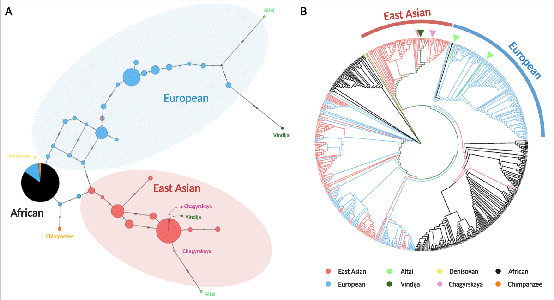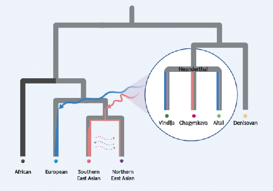 图1 欧洲人群、东亚人群中的适应性单倍型源自于不同的尼安德特人群体