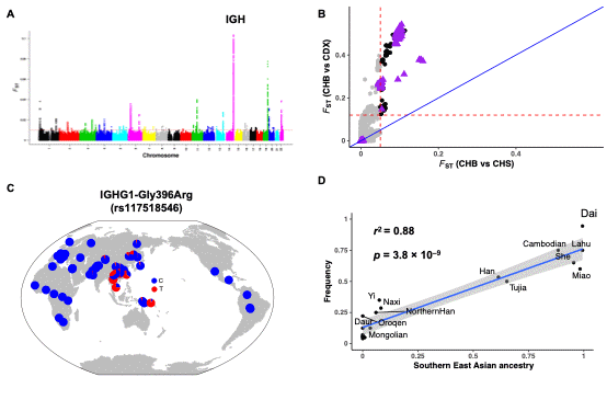 2024年7月16日,国际知名学术期刊 Molecular Biology and Evolution在线发表了复旦大学徐书华团队题为“Adaptive evolution of two distinct adaptive haplotypes of Neanderthal origin at the immunoglobulin heavy-chain locus in East Asian and European populations”的研究论文。该研究深入分析了全球各地的现代人全基因组测序数据,在欧洲人群、东亚人群14号染色体14q32.33编码免疫球蛋白重链恒定区域内分别发现一种受正向自然选择的独特单倍型。该研究进一步构建了欧亚人群中不同适应性单倍型的演化模型,并探讨了这些单倍型对现代人疫苗接种效果以及免疫类疾病易感性的潜在影响。该项工作阐明了免疫球蛋白重链恒定区的适应性演化以及趋同演化机制,不仅为理解人类免疫系统的多样性和复杂性提供了新的视角,而且为进一步研究不同族群个体的免疫反应差异提供了群体遗传和进化生物学线索和理论指导。