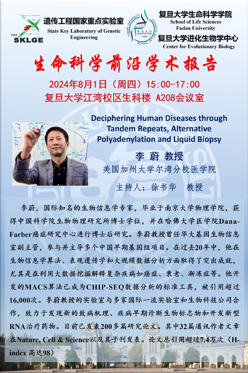 生命科学前沿学术报告-8月1日(周四)15:00-17:00 , 李 蔚 教授,美国加州大学尔湾分校医学院