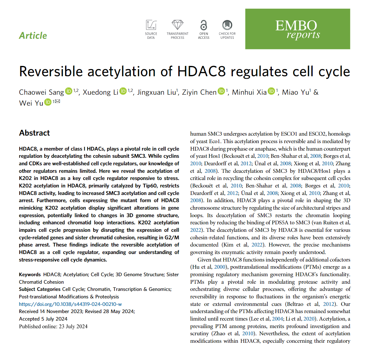 2024年7月,复旦大学余巍组在EMBO Reports在线发表题为“Reversible acetylation of HDAC8 regulates cell cycle”的文章,该研究揭示了HDAC8的可逆乙酰化修饰作为应激响应的关键细胞周期调节因子。