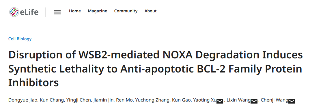 2024年8月8日,bv伟德国际体育王陈继团队、复旦大学附属中山医院王利新团队和同济大学附属第四人民医院徐耀庭团队合作在eLife在线发表了题为Disruption of WSB2-mediated NOXA Degradation Induces Synthetic Lethality to Anti-apoptotic BCL-2 Family Protein Inhibitors的研究论文(图一)。该研究首次发现CRL5WSB2 E3泛素连接酶复合体介导了NOXA的降解型泛素化修饰,从而抑制线粒体途径细胞凋亡以及对BCL-2小分子抑制剂产生原发耐药性。