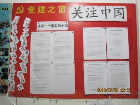 党支部以“关注中国”为主题,首先采用了以宣传栏平面展示为主的宣传方法,对今年发生的一些重大事件进行了回顾分析,包括对世博会带来影响的剖析以及对“后世博效应”的探讨,对前不久发生的钓鱼岛海域中国渔船与日本巡逻船相撞事件的追述和反思,对舟曲特大洪涝灾害中涌现出的众多感人事迹的摘录和展示,对温总理在联合国大会上的讲话“认识一个真实的中国”进行的解读……