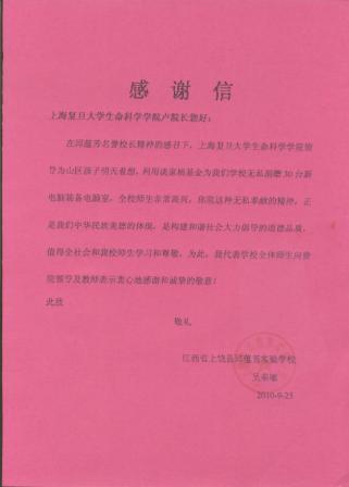 为了表达生命科学学院师生对谈老精神的怀念,支持邱蕴芳女士为山区孩子教育事业的爱心奉献,经讨论决定,生命科学学院用谈家桢基金购买30台电脑捐赠给邱蕴芳实验学校,改善学校的教学学习条件。