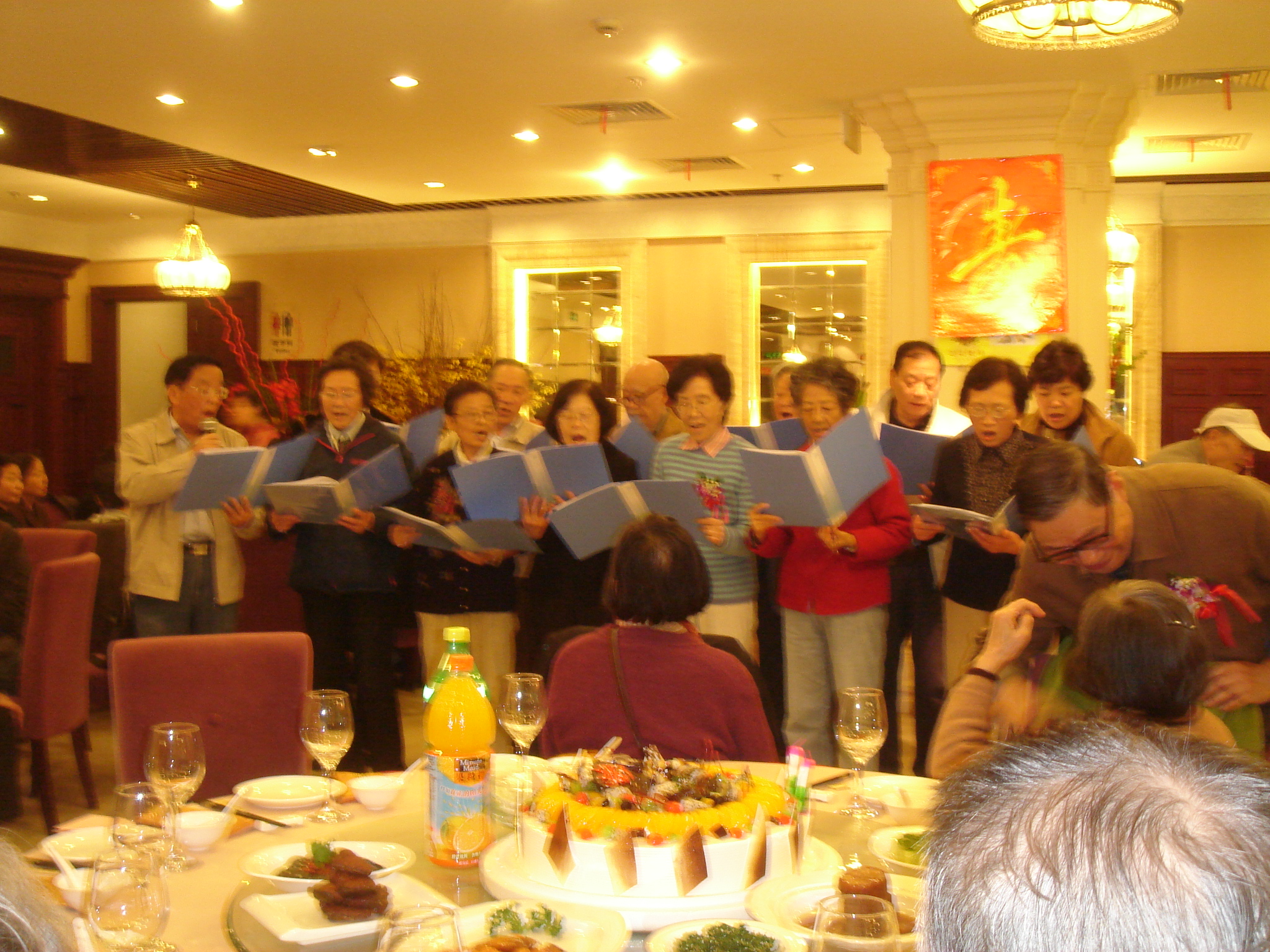 11时30分,祝寿活动在“118”合唱队员倾情献唱的三首歌曲中正式拉开了序幕。这是一支平均年龄在70岁以上的院退休教职工自命“118”的合唱队。为了这次曲目中一支新歌的“首演”,队员们不辞劳苦、风雨无阻地每周一都聚在立人生物楼118活动室排练。歌声时而慷慨激昂,时而又如柔风细雨,久久回荡在餐厅大堂。