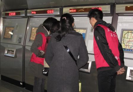 志愿者的工作主要分为两个方面:在自动售票机前为需要帮助的乘客提供协助、在站台出入口进行指引。“红马甲”们的工作看似简单,其实不然。其中最大的一个挑战在于,经常有乘客前来问询路线,因此我们需要熟悉上海轨道交通的主要条线、站点及周边道路。这可让几位来自外省市的志愿者犯了愁,为了能够给乘客们提供准确明了的信息,他们抓紧时间利用站内资源,熟悉相关信息,终于同样在志愿服务中表现出色,获得了称赞。