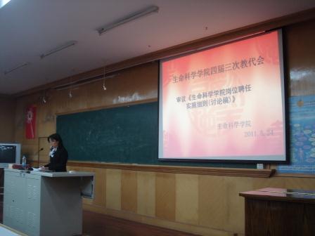 5月24日下午13:30,在立人生物楼107教室召开了生命科学学院四届三次教代会,专题讨论生命学院2011-2013年度岗位聘任实施细则。会议由工会主席刘明秋主持,她首先介绍了本次教代会的组织过程和前期征求教职工意见的情况,然后由党委书记叶敬仲老师对教职工们提出的意见进行了反馈。