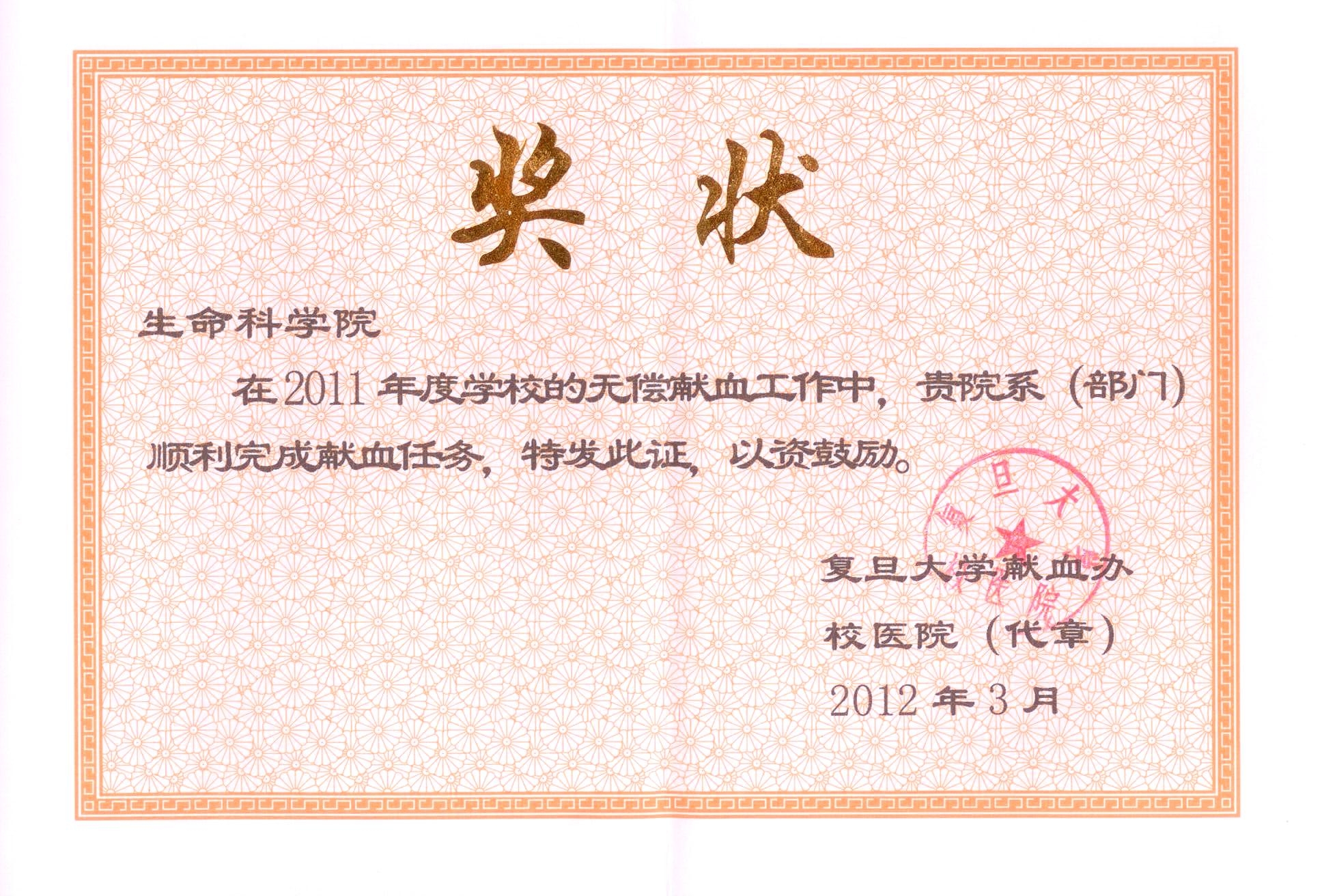 2012年3月13日上午,复旦大学上半年志愿无偿献血工作会议在校医院三楼会议室举行,会议通报了2011年我校教职工无偿献血工作的完成情况。据悉,我院王应祥、郭海强、石金磊和冯海洋四位老师参加了学校无偿献血活动,顺利完成了2011年度教职工献血任务。