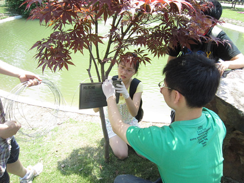 5月18日国际植物日中午,生命科学学院09级本科生党支部同学们早早来到北食门前,向过往行人派发植物日宣传手册和宣传标识,希望这些宣传册能进一步引起学校师生对植物日的关注。同时,党支部还组织同学们给北区的常见植物挂上了自己制作的红色植物铭牌。这些铭牌上写有植物的中文科、属名和拉丁学名,简要注明了其主要分布地区,并附上了相关的红色故事。党支部同学们亲手给植物挂上了这些铭牌。虽然当天天气炎热,骄阳刺目,但同学们都干得不亦乐乎,为自己能做出一份贡献而感到快乐。