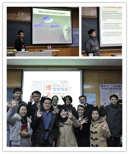王传超同学以“写在DNA中的历史”为题,讲述了使用遗传标记来分析并重构人群及文化的演化历史。比如通过南北人群中Y染色体以及线粒体中遗传标记的差异,揭示华夏民族起源和扩张;进而通过在不同地区中差异显著性的不同,有针对性的去研究,揭示汉文化传播模式,比如针对平话群体中表现出来的差异的不太显著,研究发现平话群体是汉族一致性遗传结构的例外,而汉文化在此群体中的普及则是由于汉文化的精英主导地位导致的;还有在回辉族与海南土著遗传结构类似但保持着自己文化的认同感问题上,则说明宗教在文化的演化中占有主导地位;还有语言的起源于扩散以及曹操身世之谜等问题,都说明分子人类学的数据可以很好的用于人群与文化的演化历史研究中来。