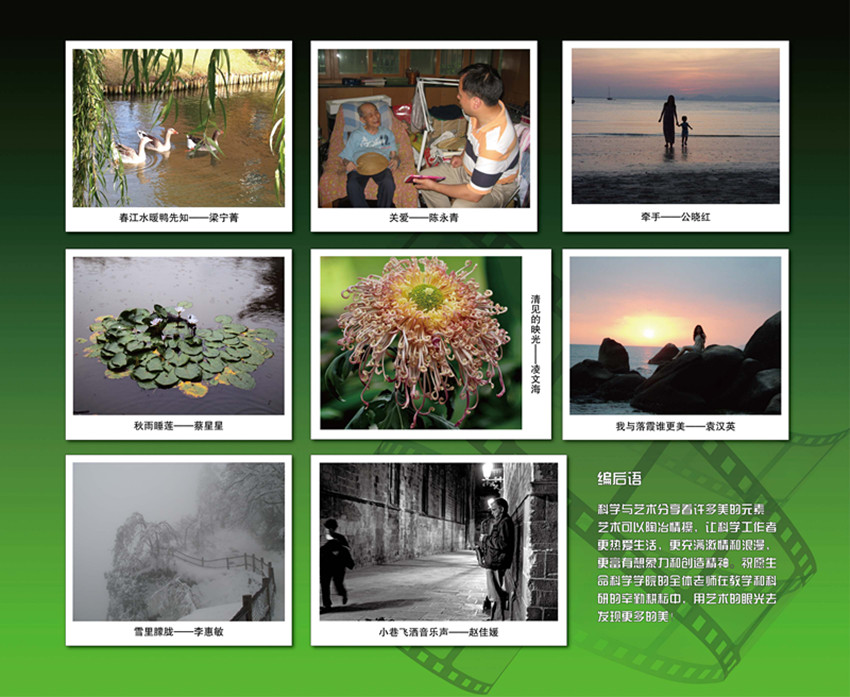 科学与艺术分享着许多美的元素。艺术可以陶冶情操,让科学工作者更热爱生活,更充满激情和浪漫,更富有想象力和创造精神。祝愿生命科学学院的全体老师在教学和科研的辛勤耕耘中,用艺术的眼光去发现更多的美!