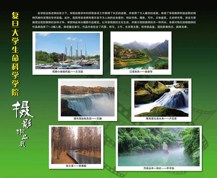 在学院全体老师的努力下,学院的教学和科研等各项工作取得了长足的进展,并获得了令人瞩目的成绩,体现了学院教师积极进取的精神风貌和深厚的学术底蕴。此外,我院很多老师有着许多不为人知的业余爱好,例如书画,摄影,写作,文物鉴赏,文史研究等,诸多方面展现出我院教师的多样才华。学院特此举办摄影作品展览,以丰富我院的文化生活,并展示我院教师的另一种风采。本展对每位投稿教师的作品都选择了1-2幅入围,体现重在参与。作品内容包含了风景,特写,工作,生活等主题,供观者品鉴。谨祝新春快乐,阖家安康。