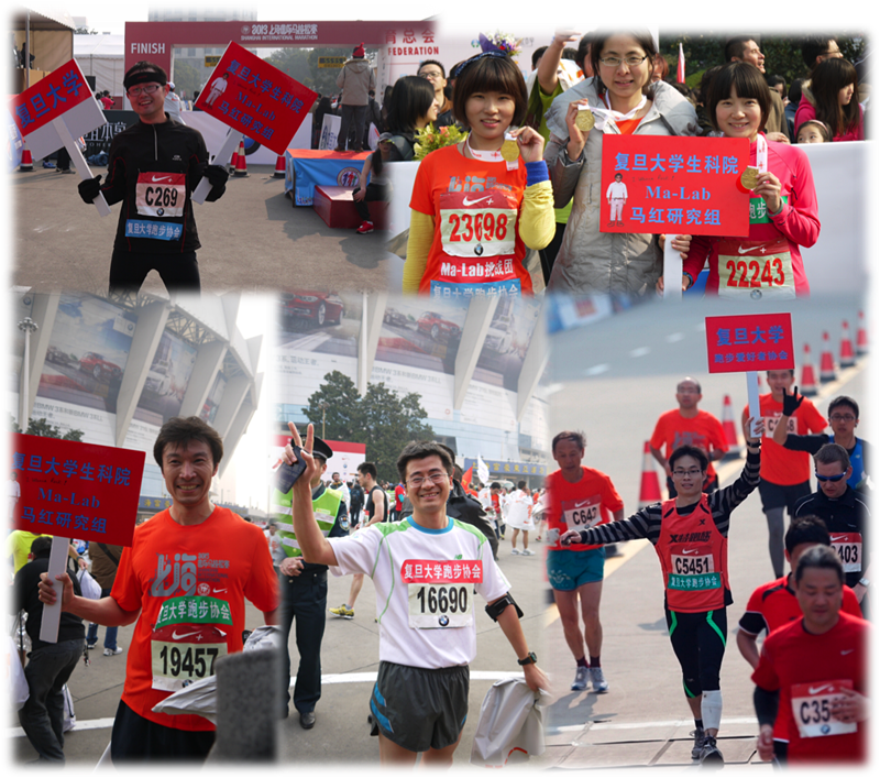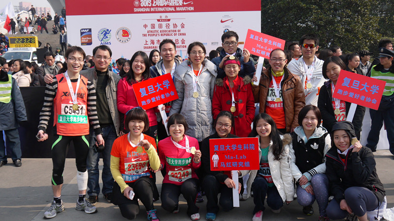 生命科学学院今年参赛师生近50人,其中学院院长马红教授课题组的16名同学分别参加了半程马拉松和全程马拉松的比赛,组成了一支抢眼的“Ma-lab挑战团”,受到媒体的关注。复旦大学校友、前生命科学学院篮球队教练王子楠更是千里迢迢从北京赶到上海参赛。参赛同学全部跑完赛程并取得了不俗的成绩。