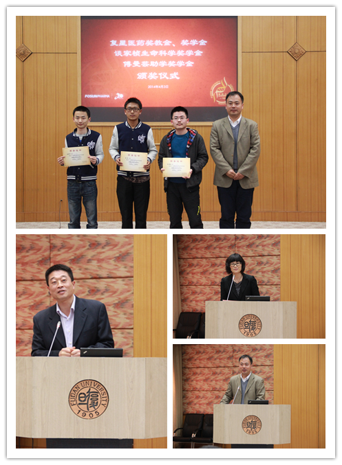 2014年4月3日下午,我院在逸夫科技楼多功能厅举行了复星医药奖教金、奖学金,傅曼芸助学奖学金和谈家桢生命科学奖学金的联合颁奖典礼。出席会议的有复星医药集团高级副总裁李春先生,复旦大学对外联络与发展处处长、复旦大学教育发展基金会副秘书长潘俊老师,院党委书记陈浩明老师等。