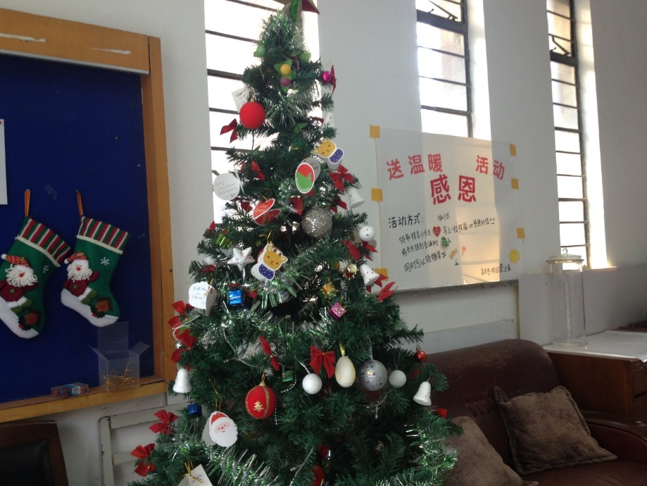 2014年12月,利用圣诞节的契机,“向日葵之家”还面向全院同学,发起了“圣诞感恩寄语”的活动。“感恩”不仅是一种生活态度,也是一种品德,是一片肺腑之言,如果人与人之间缺乏感恩之心,必然会导致人际关系的冷淡,所以,每个人都应该学会“感恩”。学生要学会“感恩”,其实就是要让学生懂得尊重他人。2014年18日我们制作了海报以及小卡片,并购买了一些小的糖果。我们将卡片以及糖果还有圣诞树放置在了生物二楼的门口,并张贴了海报,希望同学可以将感恩的话语写在卡片上并挂在圣诞树上。