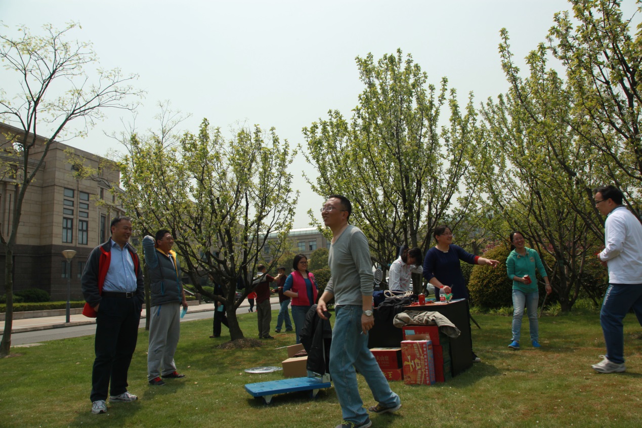 4月16日星期四的中午,阳光明媚,暖风徐徐。江湾校园,法学院旁,樱花树下,绿茵之上,生命科学学院工会为全体教职工提供了一次别开生面的趣味运动会。将飞盘挂在樱花树下比试飞镖,将垃圾回收箱做篮筐练练投篮精准,几辆自行车围成球门秀秀射门脚法,还有端球接力、跳长绳、滚铁环、踢毽子,虽然设施简单,但形式独特,气氛高涨。短短2小时左右的午休时间,趣味运动会吸引了近百位教职工老师的参与,党委书记陈浩明老师也来小试拳脚。草地上老师们的欢笑声此起彼伏,同学们的喝彩声亦不绝于耳。活动后,每位参加两个项目以上的老师还能获得一份小礼品,参加全部项目的老师获得双份礼品。工会主席杨亚军老师说:“礼品虽小,但希望能鼓励老师们从办公室里走出来,关注运动与健康。”活动后很多老师都表示这样的趣味活动可以健身和福利两不误,还促进了老师们的交流,希望工会能多组织。