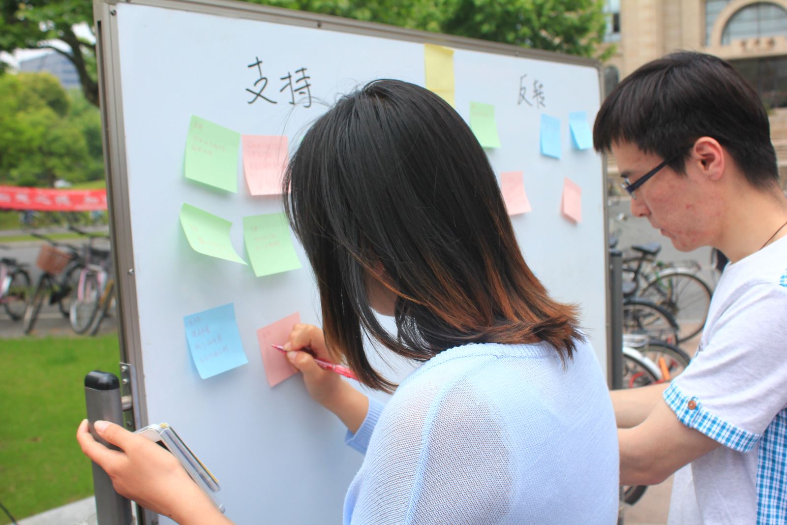 当天中午11点支部同学们就来到现场进行准备工作,11:30科普活动正式开始。本次活动设置了3个版块:展板区,有奖问答区,以及表态区。展板区通过展板的形式展示了转基因食品的发展史、目前已商业化的转基因食品、全球允许种植转基因作物的国家、转基因作物种植的种类和面积、以及关于转基因食品的热门问题,同时有同学负责向人们进行解释,让大家能对转基因食品有更加全面的了解。有奖问答区则设置了关于转基因的问答题,让浏览完展板的人们可以抽取题目并进行回答,通过问答的形式加深人们对转基因的认识。表态区则设置了一块白板,让大家可以随意的抒发自己对转基因食品的态度,不论是支持、反对,还是中立。整场活动气氛热烈,大家互动良好,不少参与了活动的同学都感慨“不看不知道,原来自己已经吃了这么多转基因食品”。