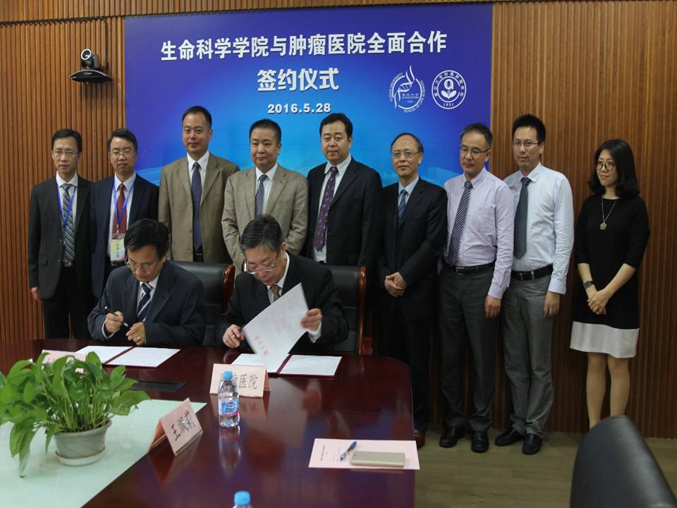 2016年5月28日,在bv伟德国际体育九十周年院庆之际,生命科学学院与附属肿瘤医院在复旦大学江湾校区生命大楼A208会议室签署了全面合作协议。生命科学学院党委书记陈浩明主持签约仪式。仪式上肿瘤医院院长郭小毛和生命科学学院院长马红相互签署并交换了合同文本,金力副校长与其他领导和相关代表参加了仪式,见证了基础生命科学研究与临床肿瘤医学应用相互结合的重要时刻。
