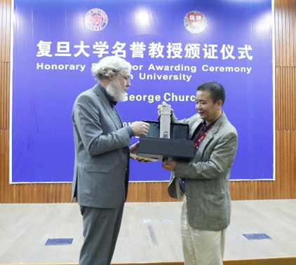 10月29日下午,生命科学学院在学院F区报告厅举行了George Church教授为“复旦大学名誉教授”的颁证仪式暨Personal Genome Project(PGP)China启动仪式。出席本次荣誉教授颁证仪式的有复旦大学副校长金力院士、科技处副处长范仁华教授以及生命科学学院执行院长林鑫华教授、杨忠副院长、吴纪华副院长等相关领导、老师和校友。会议由生命科学学院执行院长林鑫华教授主持并介绍prof. George Church的成就。
