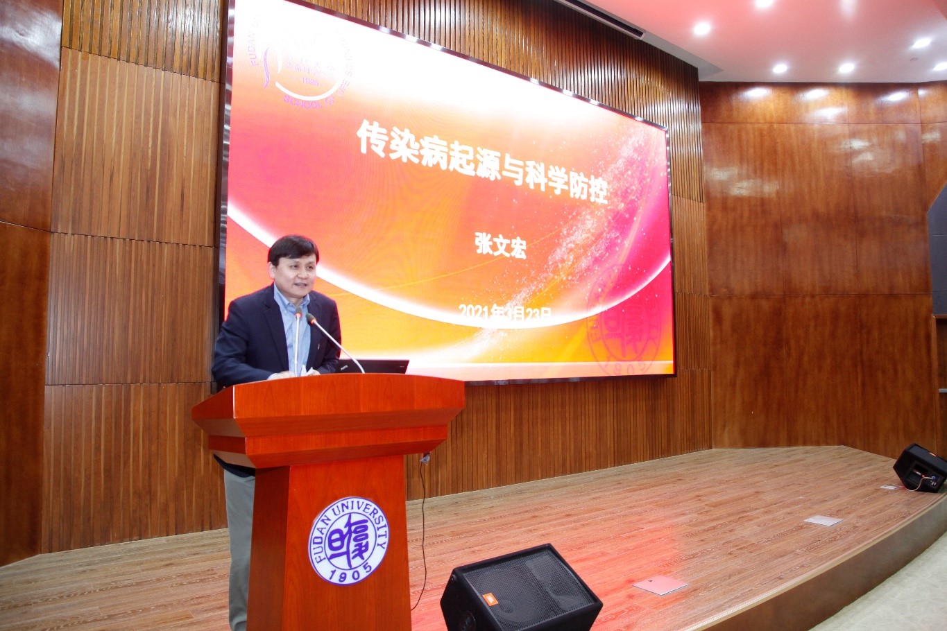 2021年3月23日下午15:00,在复旦大学新江湾校区生命科学学院F区报告厅。复旦大学附属华山医院感染科主任,复旦大学临床医学院内科学系主任,兼任上海市抗新冠临床救治专家组组长张文宏教授,为生命科学学院全体教师和部分学生党员代表做了一场题目为《传染病起源与科学防控》的专题报告,报告由生命科学学院分党委书记陈浩明主持。