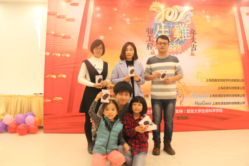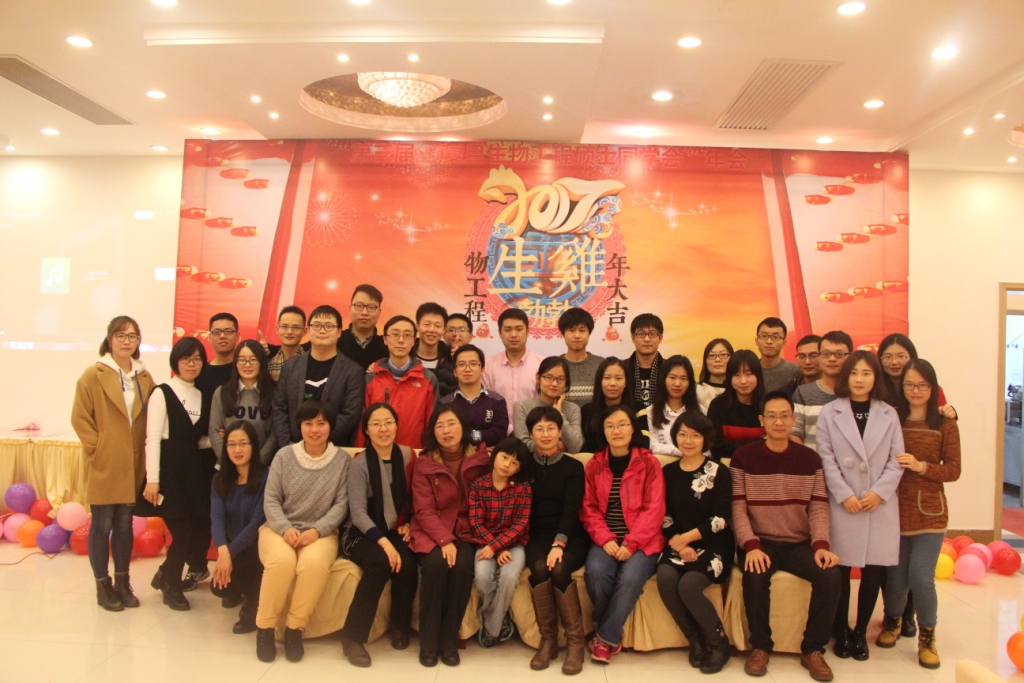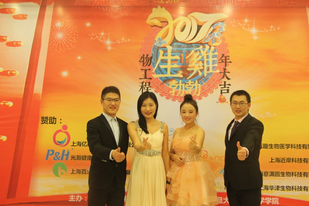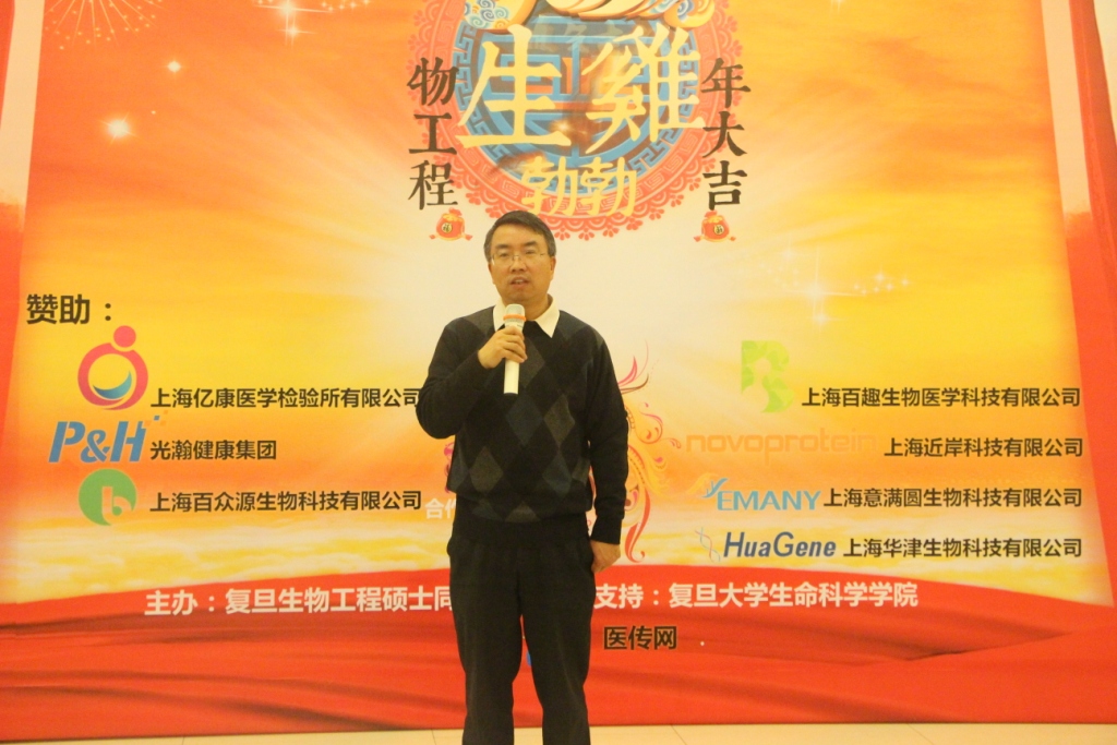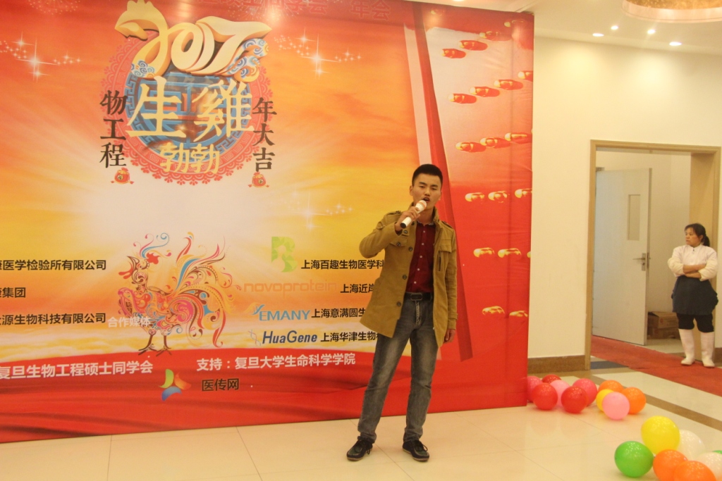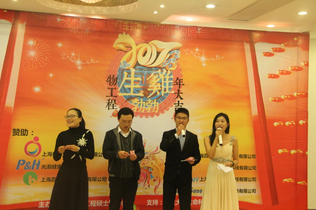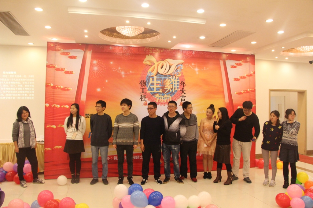 复旦科技处老师、复旦生科院老师、上海近岸科技有限公司、上海百众源生物科技有限公司、上海意满圆生物科技有限公司、上海华津生物科技有限公司各位嘉宾代表以及复旦生物工程硕士班2009级至2016级同学参加了此次年会和联欢晚宴,全体人员共同度过了一个难忘而欢乐的夜晚,师生之情永记于心,同窗情谊共同珍藏,新年“鸡”会共同开创!