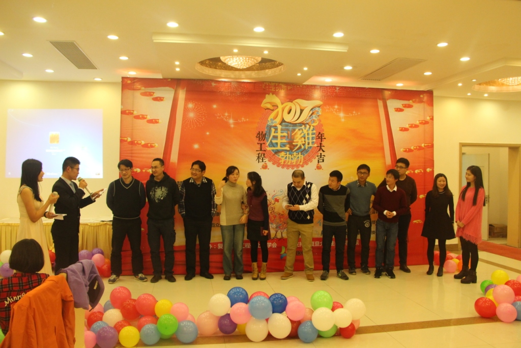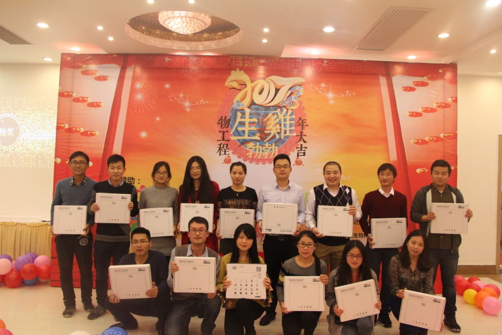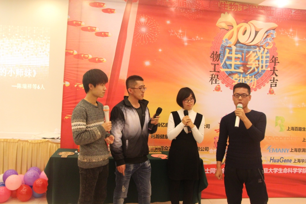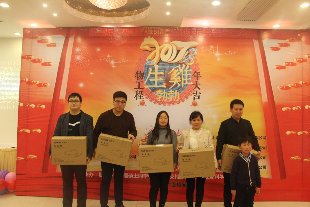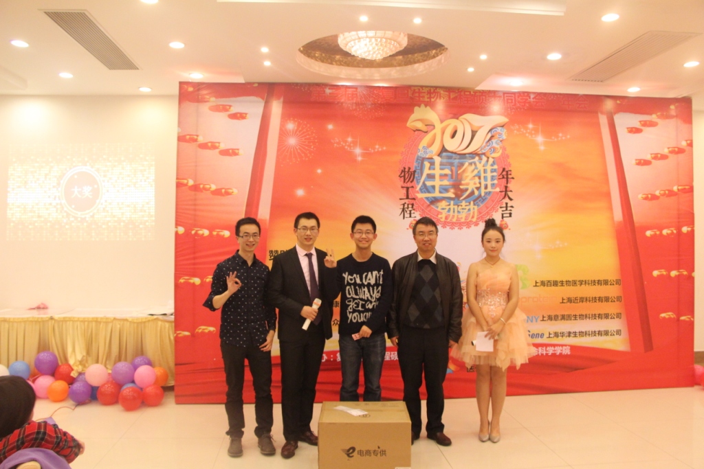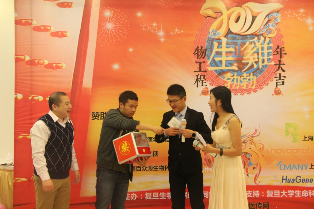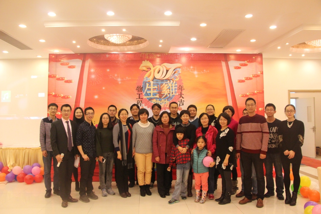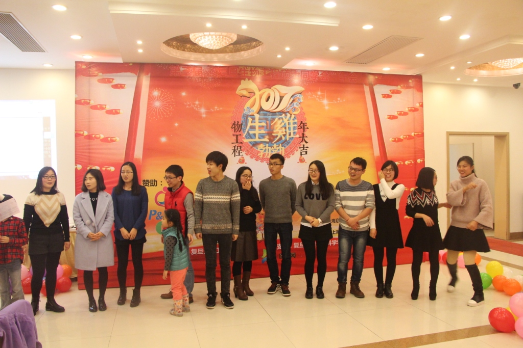复旦科技处老师、复旦生科院老师、上海近岸科技有限公司、上海百众源生物科技有限公司、上海意满圆生物科技有限公司、上海华津生物科技有限公司各位嘉宾代表以及复旦生物工程硕士班2009级至2016级同学参加了此次年会和联欢晚宴,全体人员共同度过了一个难忘而欢乐的夜晚,师生之情永记于心,同窗情谊共同珍藏,新年“鸡”会共同开创!