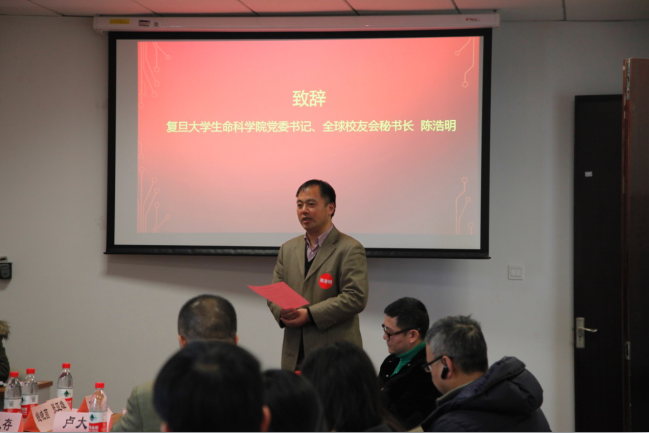 随后,复旦大学生命科学院党委书记、全球校友会秘书长陈浩明在致辞中表示,2016年生科院90华诞之际,感谢校友们积极参与院庆活动,积极参与生科90基金的捐赠,尤其感谢校友们在学院文化建设方面所做的贡献,2016年学院新增校友捐赠的院铭石、春色满园的屏风及地球仪,学院也做了院士墙,谈老的塑像,现代人类学终身成就奖的雕塑等。这些建筑作为文化的载体,背后有着深刻的文化印记和人文精神,他鼓励校友回校来留下更多的文化印记。最后,陈书记建议校友会应更多举办跨行业校友论坛,多邀请校友回母校为学弟学妹做报告。