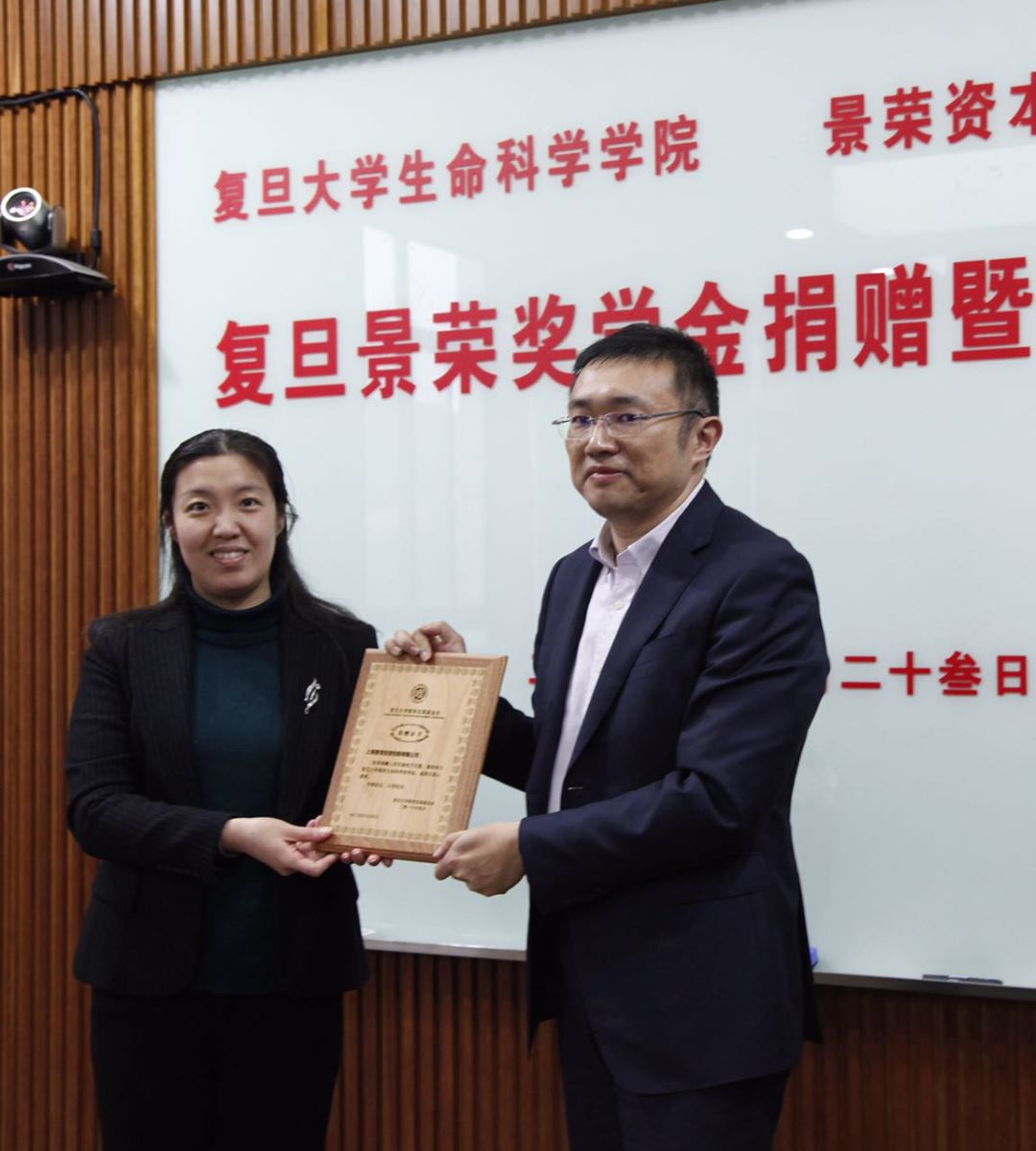 复旦大学 对外联络发展处副处长陆颖丰向上海景荣投资控股有限公司授予捐赠证书。