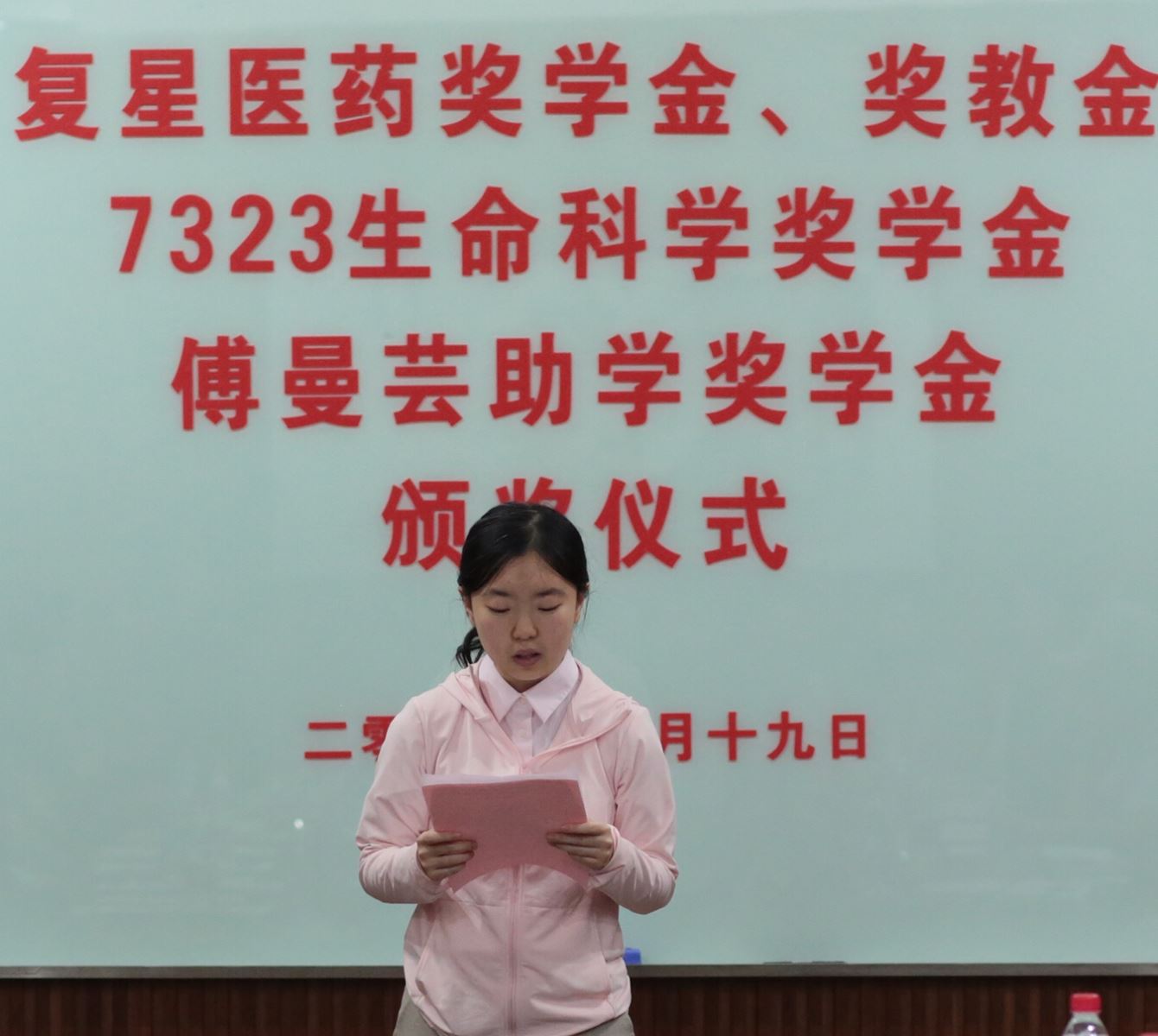 为了能够让在场师生们更深入的了解复星医药,在颁奖典礼开始之初,复星医药首先播放了集团的宣传片,介绍了复星医药的企业理念以及发展现况。随后,陈浩明书记分别介绍了复星医药奖教(学)金,7323生命科学奖学金,傅曼芸助学奖学金三大奖项的背景情况,并代表学院感谢复星医药、7323微生物班以及谈家桢基金会对学院的慷慨资助。
