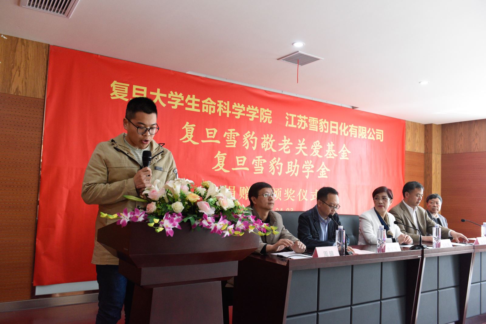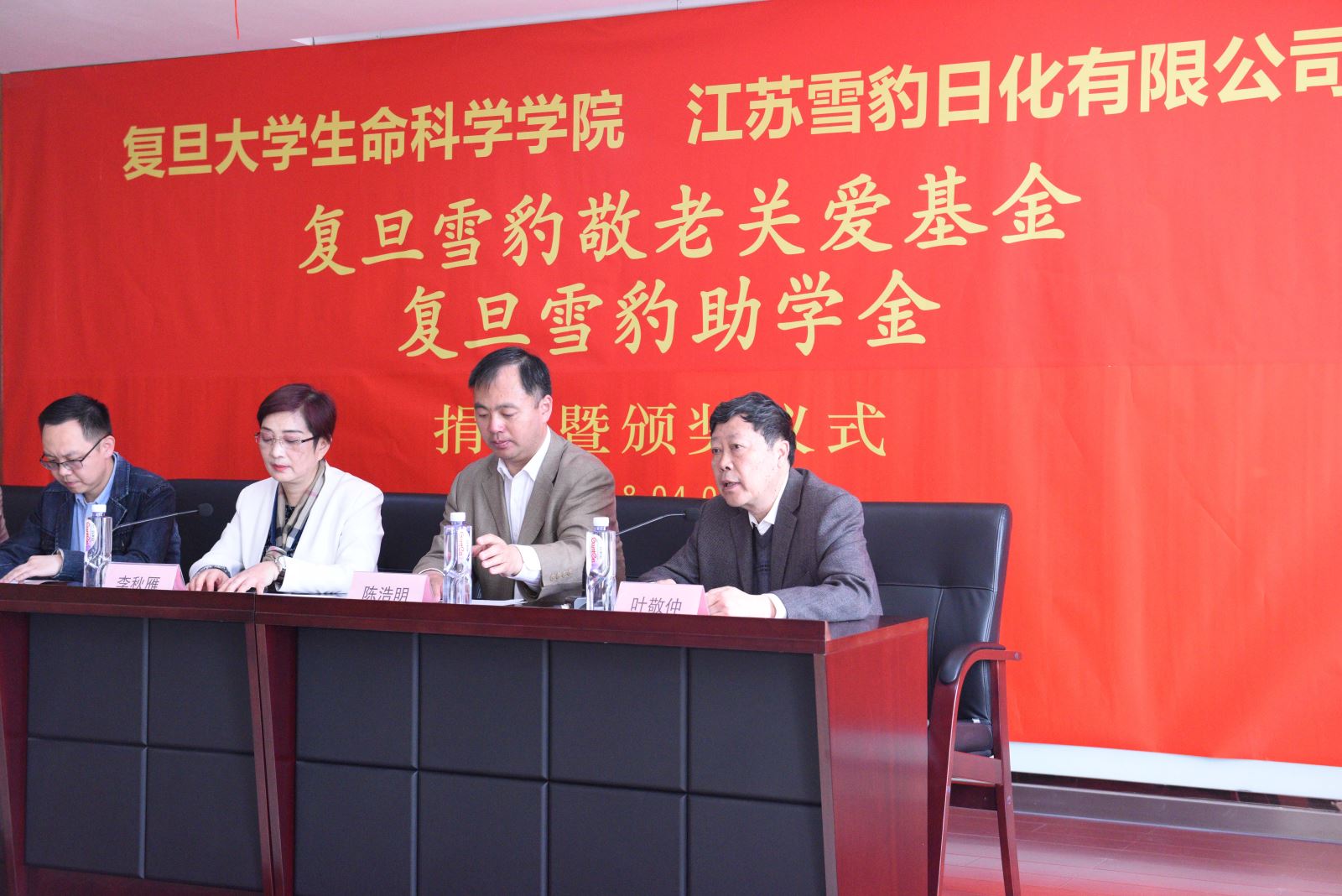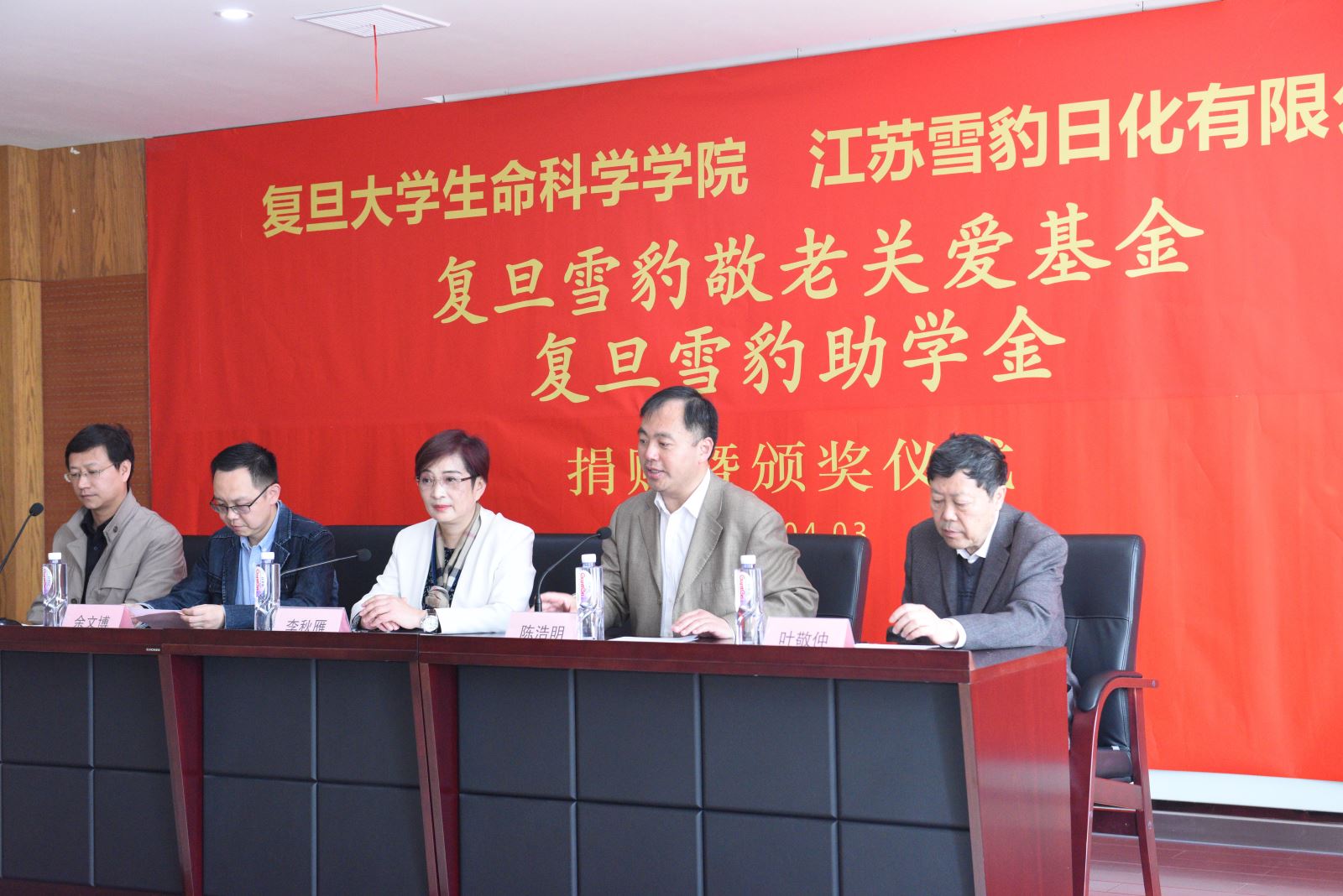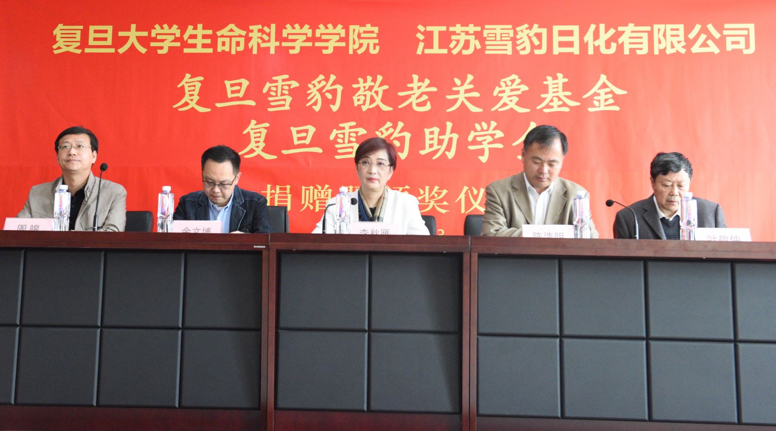 4月3日上午,坐落在江苏江阴的江苏雪豹日化有限公司成功举办“复旦雪豹敬老关爱基金”和“复旦雪豹助学基金”颁奖仪式。bv伟德国际体育党委书记陈浩明、党委副书记余文博、学院前党委书记、院退管工作委员会副主任叶敬仲、校友秘书王晓静、雪豹助学金受助学生代表等参加了颁奖仪式。