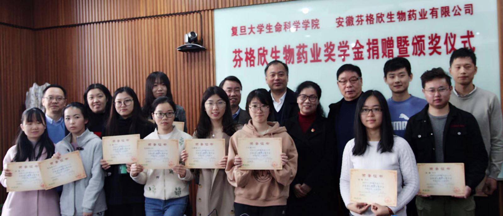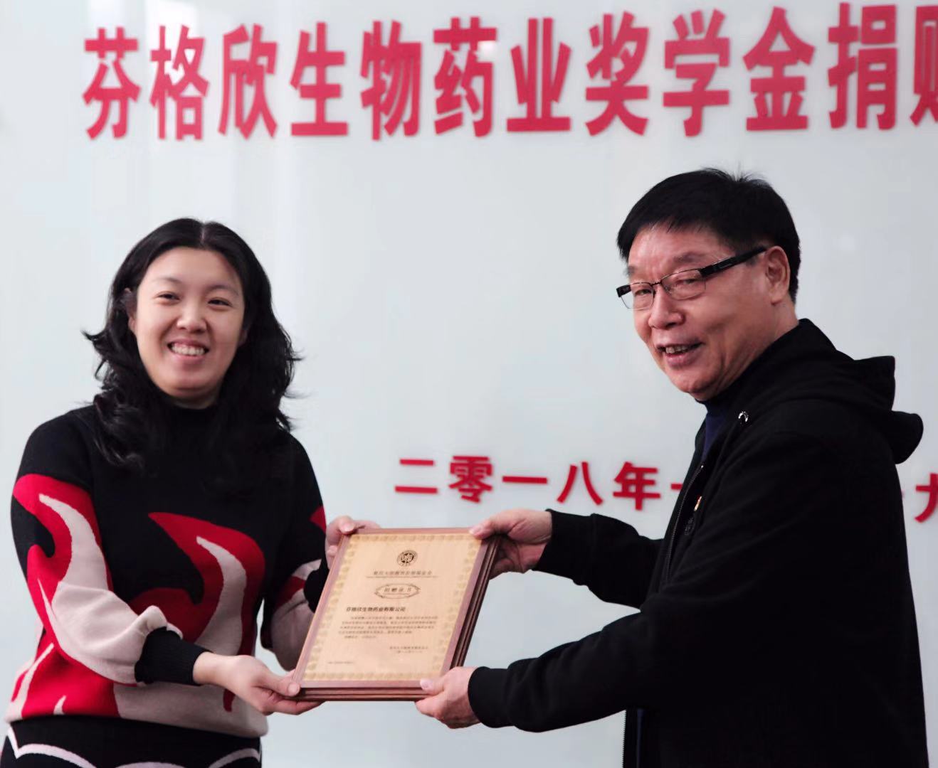 复旦大学对外联络与发展处副处长陆颖丰授予安徽芬格欣生物药业有限公司捐赠证书。