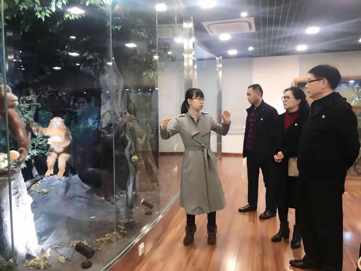 颁奖仪式后,bv伟德国际体育实验教学中心副主任吴燕华带领徐邦杰董事长一行参观了祖嘉博物馆,哺乳、鸟类是其中最大的两个展厅,种类繁多、制作精美。两馆中存放着珍贵的大熊猫、白鳍豚、灵长类以及鹤、鹳、猛禽、鸡类等国家级一级保护鸟类标本。吴主任对这些动物的分类、生理特征和生活习性一一进行讲解,徐董事长啧啧称赞,表示大开眼界。