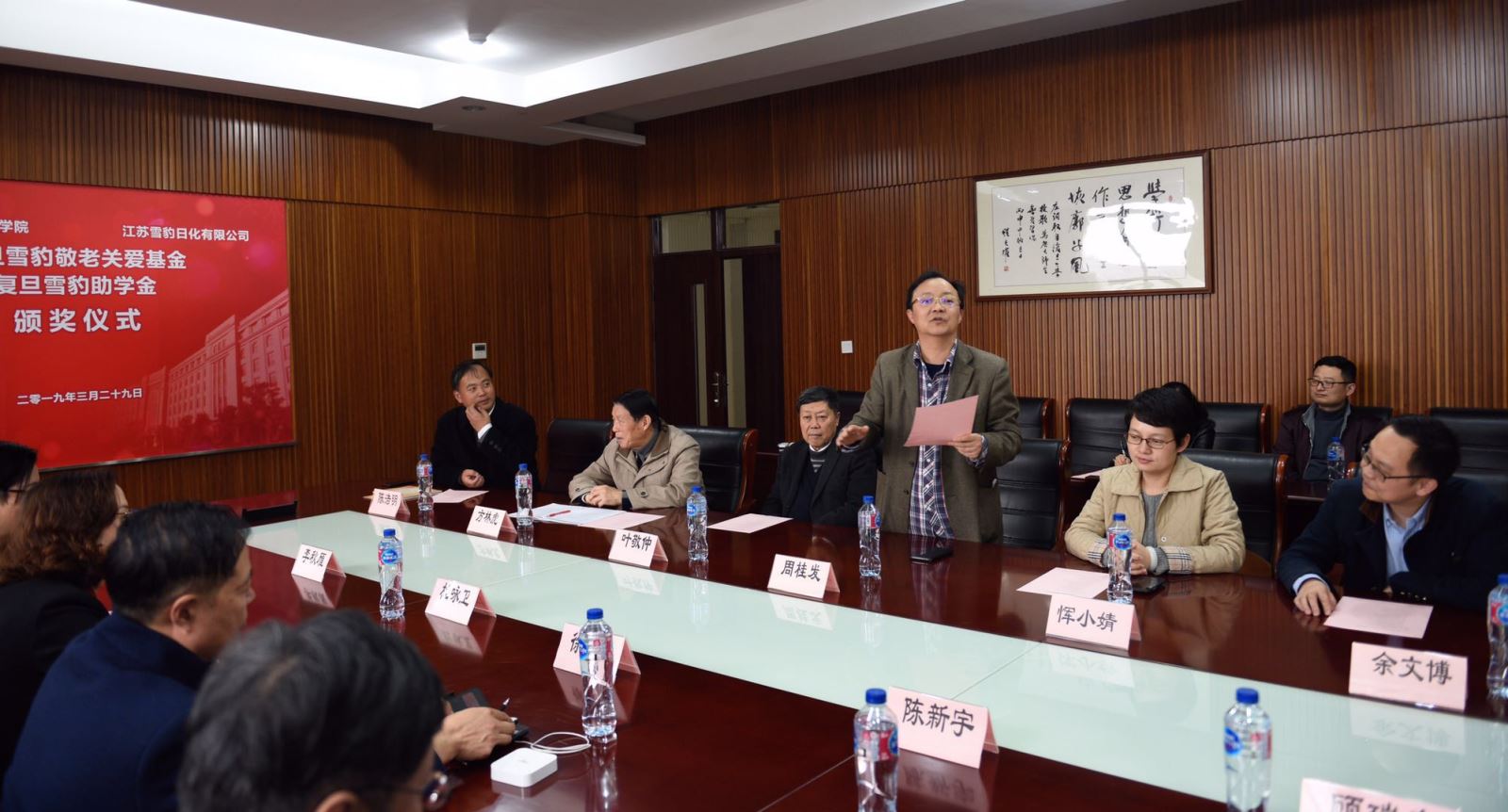 仪式开始,陈浩明书记发表致辞,他首先感谢雪豹公司从2016年开始设立“雪豹敬老关爱基金”和“雪豹助学金”,今年是捐赠的第三年。雪豹日化27年前与复旦大学联合攻关,研制成功“世界上第一支生物牙膏”,缓解无数人口腔问题,实现巨大社会价值。当风度翩翩的教授们已步入老年,雪豹立即想到资助学院生病住院或生活需要关心的退休教师,让每一位老教师都能安享晚年幸福生活。在学院,雪豹公司开创了设立敬老关爱基金的先河。