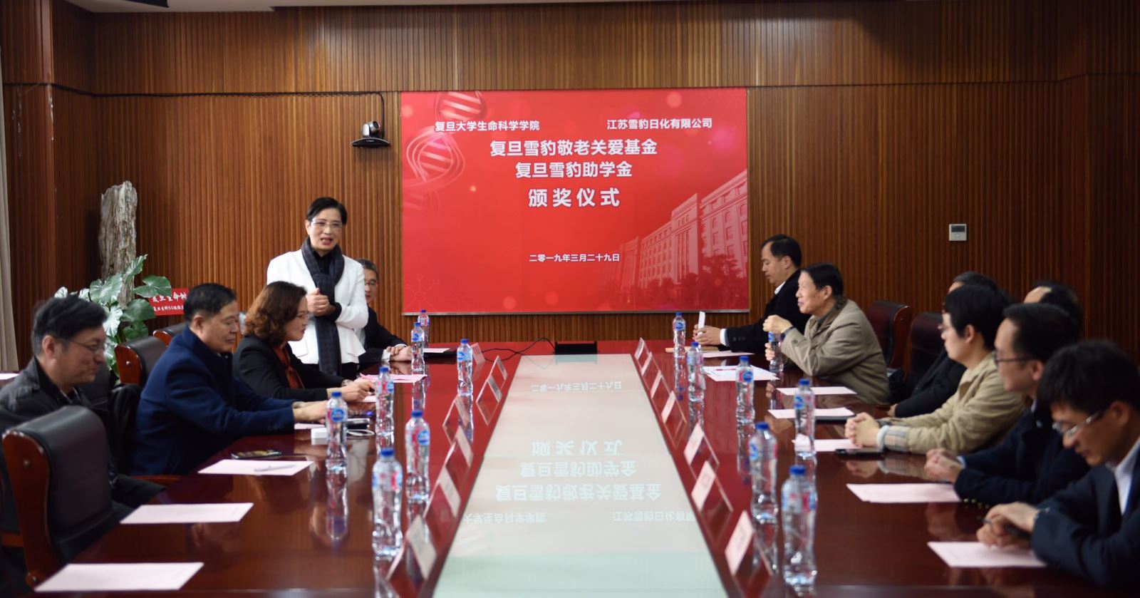 2019年3月29日下午,复旦雪豹敬老关爱基金和雪豹助学基金颁奖仪式在生命科学学院A208会议室隆重举行,复旦大学老教授协会会长方林虎,复旦大学退管会常务副主任周桂发,复旦大学对外联络与发展处副处长恽小婧,江苏雪豹日化有限公司董事长李秋雁一行,bv伟德国际体育分党委书记陈浩明,分党委副书记余文博、丁澦,院退管工作委员会副主任叶敬仲出席颁奖仪式。会议由陈浩明书记主持。