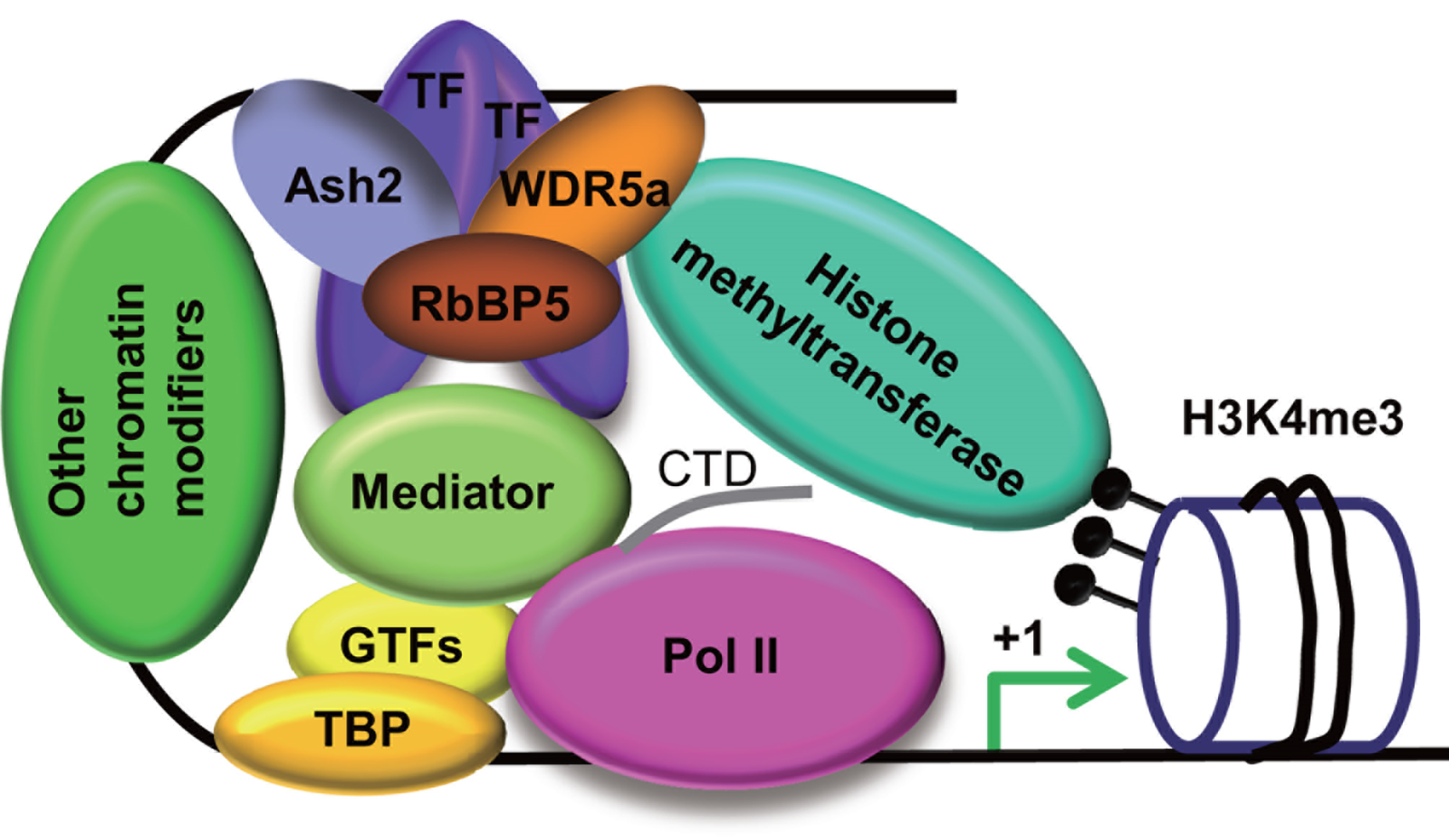 在真核细胞的细胞核中,遗传信息的载体脱氧核糖核酸(DNA)缠绕在组蛋白八聚体上形成核小体结构,进一步包装成染色质。在这种紧密包装的状态下,基因无法表达,遗传信息很难被读取。染色质重塑和组蛋白修饰能影响染色质状态,调控基因的表达。有报道指出全基因组水平上基因启动子附近组蛋白H3第4位赖氨酸三甲基化(H3K4me3)修饰与基因表达有很强的正相关,但基因启动子上的组蛋白H3K4me3修饰是如何特异和及时发生的分子机理并不是很清楚。复旦大学刘建祥课题组与中国科技大学丁勇课题组合作,发现并证明了在植物转录起始复合物(PIC)的装配过程中,基因特异转录因子(bZIP28或bZIP60)与类罗盘(COMPASS-like)复合物成员(Ash2或WDR5a)相互作用,影响目标基因启动子附近组蛋白H3K4me3水平,调控植物内质网胁迫应答下游基因的表达。内质网胁迫应答由内质网中错误折叠蛋白积累所引起,与多种人类疾病和植物适应极端环境变化密切有关。