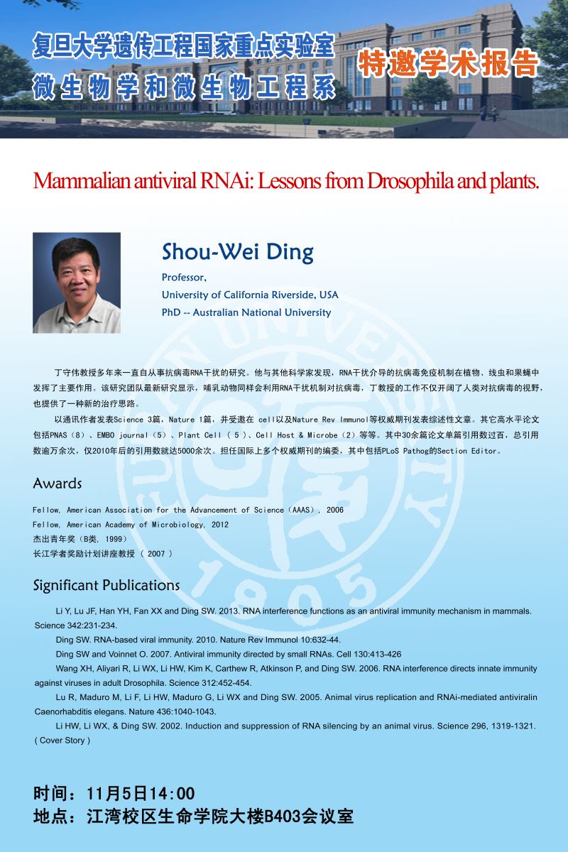 报告人:Shou-Wei Ding(Professor),University of California Riverside, USA