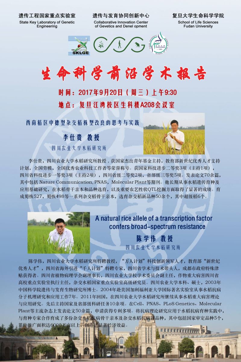 生命科学学术前沿讲坛【77、78】20170920:李仕贵、陈学伟教授