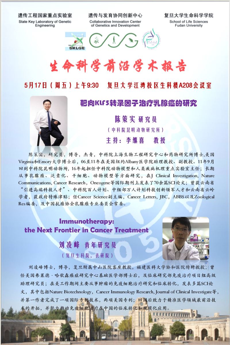 生命科学学术前沿讲坛【116】20190517:陈策实 研究员(中科院昆明动物研究所),刘凌峰 青年研究员(复旦生科院、表研院)