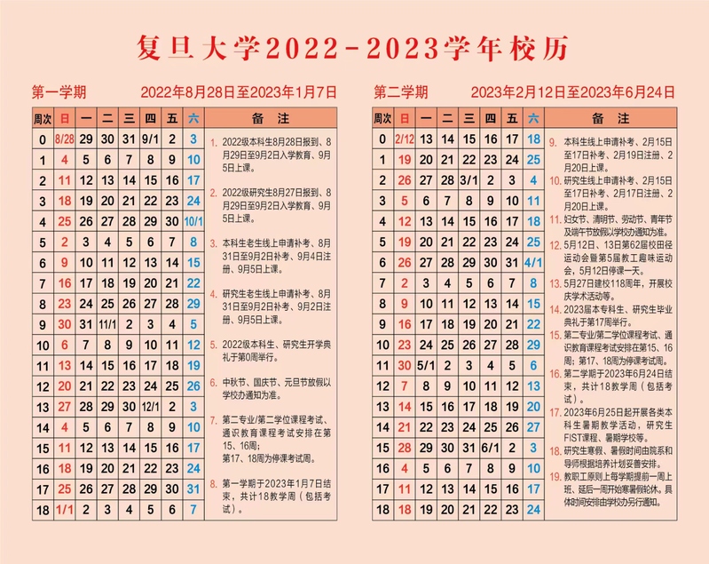 2022年秋季学期于9月5日(第一周周一)开始上课,本学期授课时间16周,第17,18周为集中考试周。随堂考试安排在第16周上课时间。中秋节连周末放假9月10-12日;国庆长假放假10月1-7日,原排10月6日周四教学任务调至10月8日,原排10月7日周五教学任务调至10月9日。