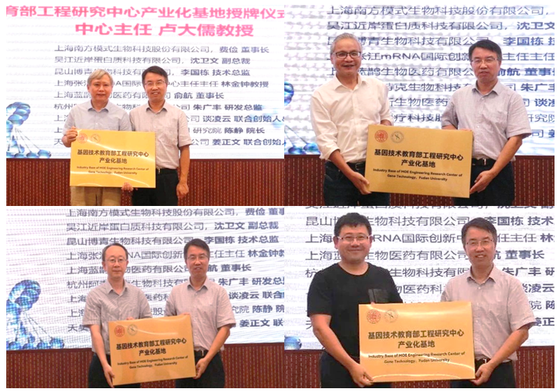 首批入选基因技术教育部工程中心产业化基地企业有上海南模科技股份有限公司等8家,分别由相关企业代表:南模生物董事长费俭、近岸蛋白副总裁沈卫文、博青生物技术总监李国栋、蓝鹊生物董事长俞航、阿泰特克生物研发总监朱广丰、韦翰斯生物医药联合创始人兼常务副总裁谈凌云、伯杰医疗研究院院长陈静、天昊生物医药联合创始人/董事长姜正文依次上台接受基地铭牌颁发,并合影留念。这8家企业分别是:上海南方模式生物科技股份有限公司;苏州近岸蛋白质科技有限公司;昆山博青生物科技有限公司;上海张江mRNA国际创新中心-上海蓝鹊生物医药有限公司;杭州阿泰特克生物科技有限公司;上海韦翰斯生物医药科技有限公司;上海伯杰医疗科技股份有限公司研究院;天昊生物医药科技(苏州)有限公司。