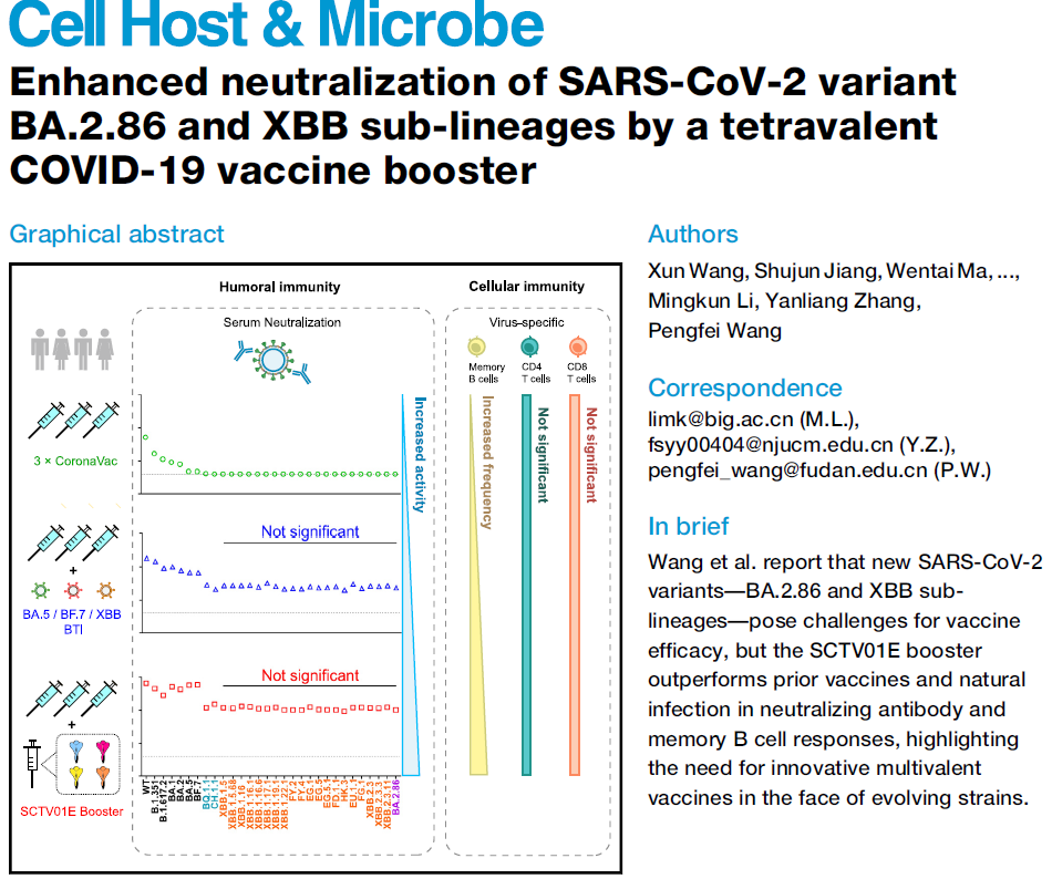 随着新冠病毒不断进化,新的变异株如XBB.1.5、XBB.1.16、EG.5.1、HK.3(FLip)和XBB.2.3等出现,尤其是最新的BA.2.86因其繁多的刺突蛋白突变令人担忧。变异株不断出现,现有新冠疫苗是否能对新变异株产生足够的免疫效果?当前应该选择接种哪款疫苗?2023年11月28日,bv伟德国际体育王鹏飞联合南京市中医院及中国科学院北京基因组研究所在内的多个团队于国际微生物学领域顶级期刊Cell Host & Microbe在线发表题为“Enhanced neutralization of SARS-CoV-2 variant BA.2.86 and XBB sub-lineages by a tetravalent COVID-19 vaccine booster”的研究论文,报道了神州细胞研发的四价新冠疫苗SCTV01E作为加强针对30种不同新冠变异株的交叉中和能力及细胞免疫水平。研究发现,与仅接种灭活疫苗或接种灭活疫苗后突破感染相比,SCTV01E疫苗加强免疫对变异株产生了更高的中和抗体和病毒特异性记忆B细胞,表明开发新型多价疫苗可更有效地抵御病毒持续变异。